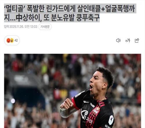 另一韩媒发文标题大意是:林加德梅开二度却遭凶铲+面部暴力,上海再演惹怒功夫足球(下图)。文章批评张琳芃的危险凶铲有可能导致林加德受伤。